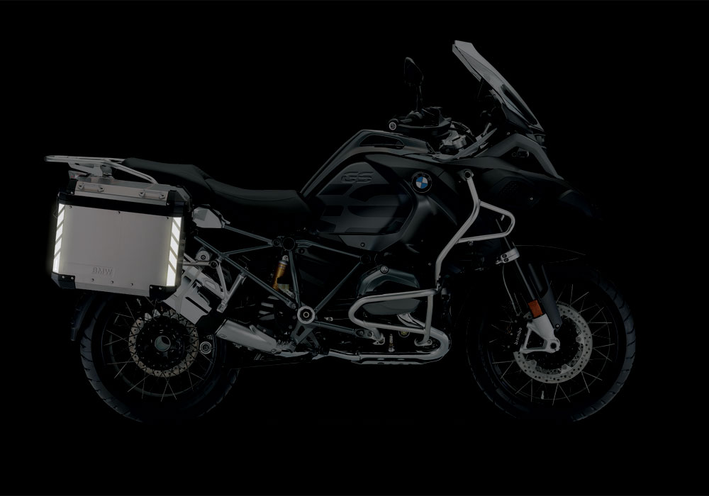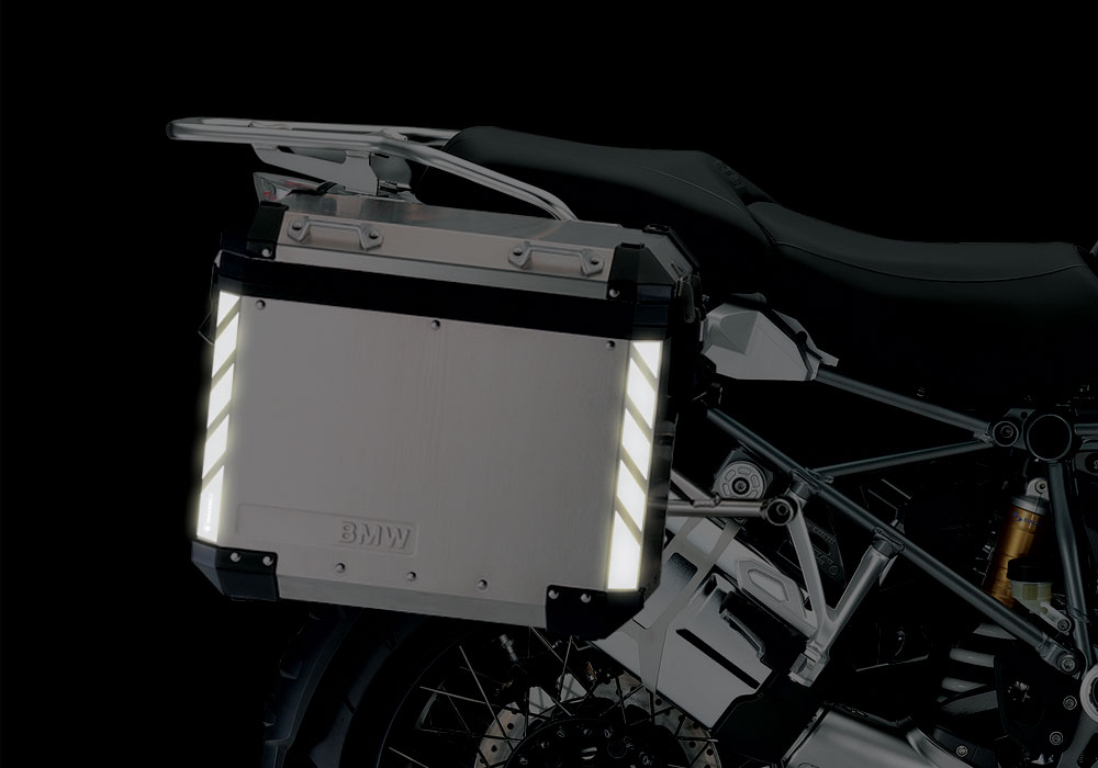 Signature Custom Designs reflective Stripes, gives to your BMW Aluminum Side Panniers visibility during the night.