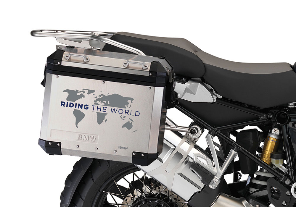 Signature Custom Designs THE GLOBE Series styling kit, gives your BMW Aluminum Panniers a unique and travel character.
