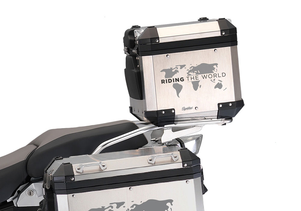 Signature Custom Designs THE GLOBE Series styling kit gives your BMW Aluminum Top Box a unique and Adventure character.
