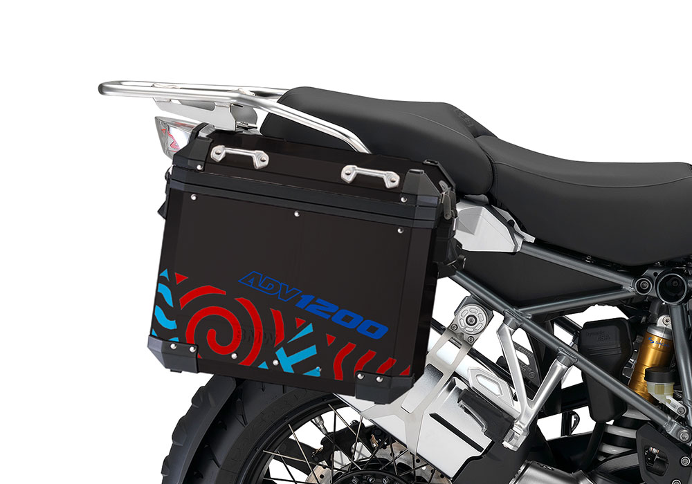 BMW Black Aluminum Side Panniers Four Elements Toxic Blue & Red Stickers