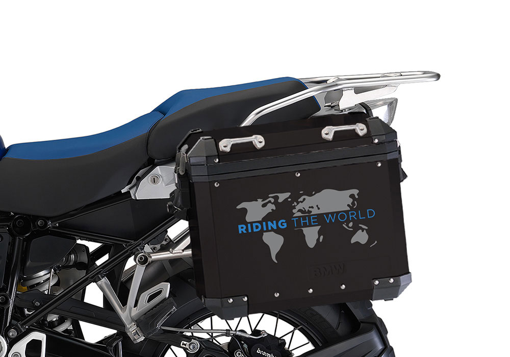 BMW Black Aluminum Side Panniers The Globe Grey & Blue Stickers