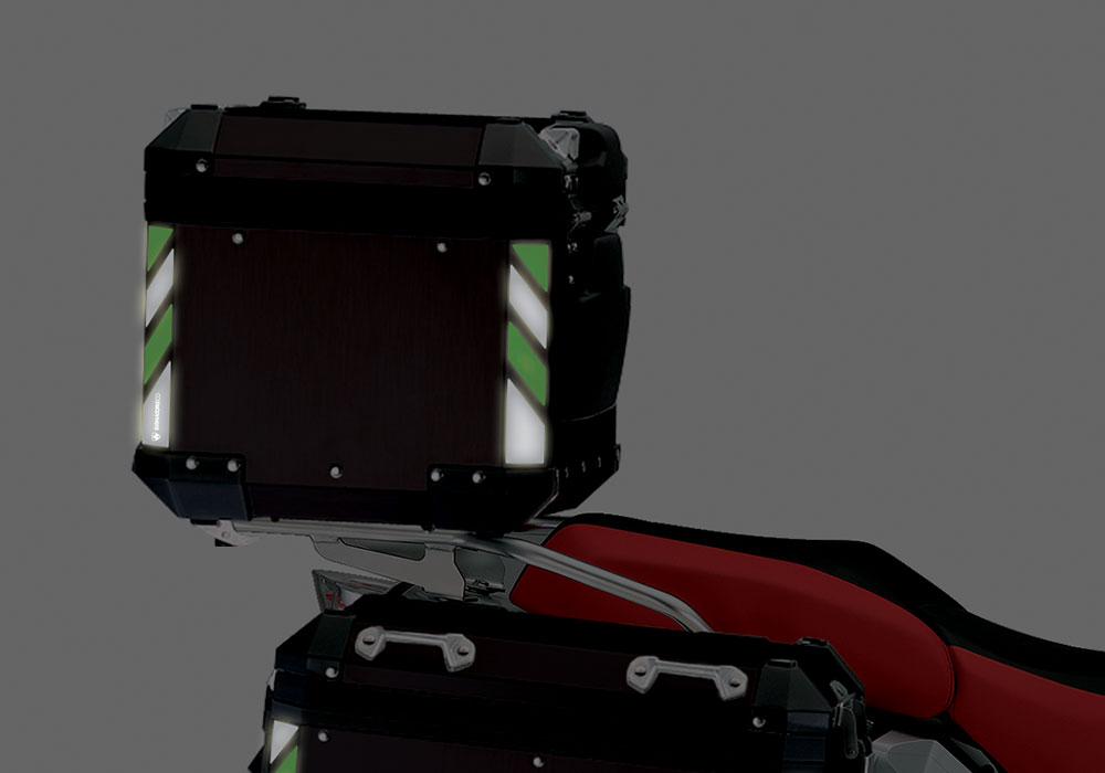 Signature Custom Designs reflective Stripes gives your BMW Black Aluminum Top Box visibility during the night.