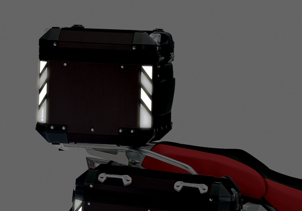 Signature Custom Designs reflective Stripes gives your BMW Black Aluminum Top Box visibility during the night.