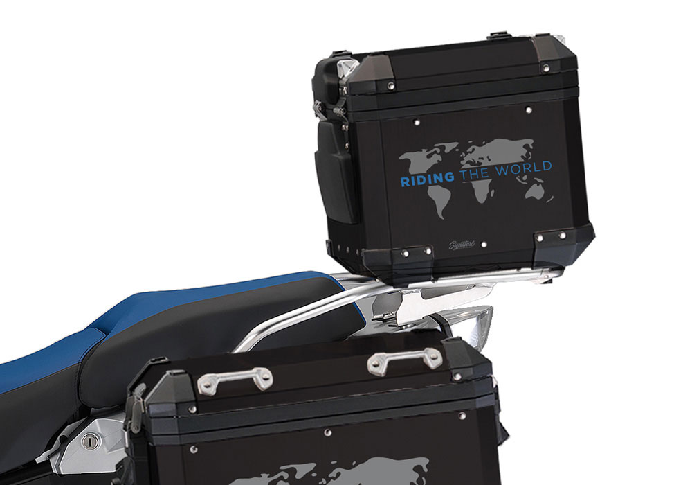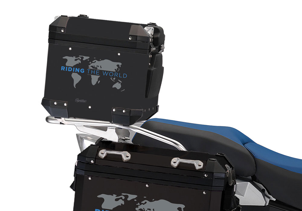 Signature Custom Designs THE GLOBE Series styling kit gives your BMW Black Aluminum Top Box a unique and Adventure character.