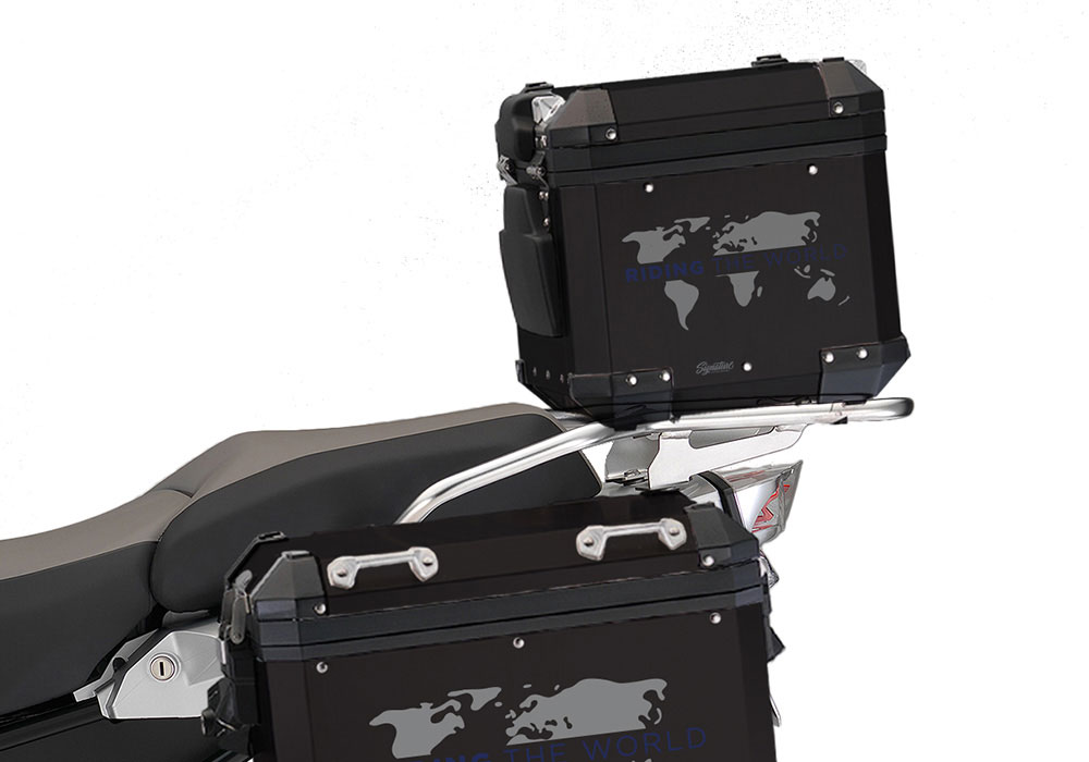 Signature Custom Designs THE GLOBE Series styling kit gives your BMW Black Aluminum Top Box a unique and Adventure character.