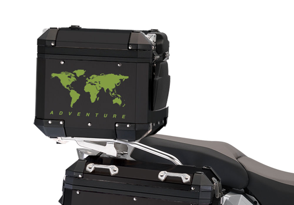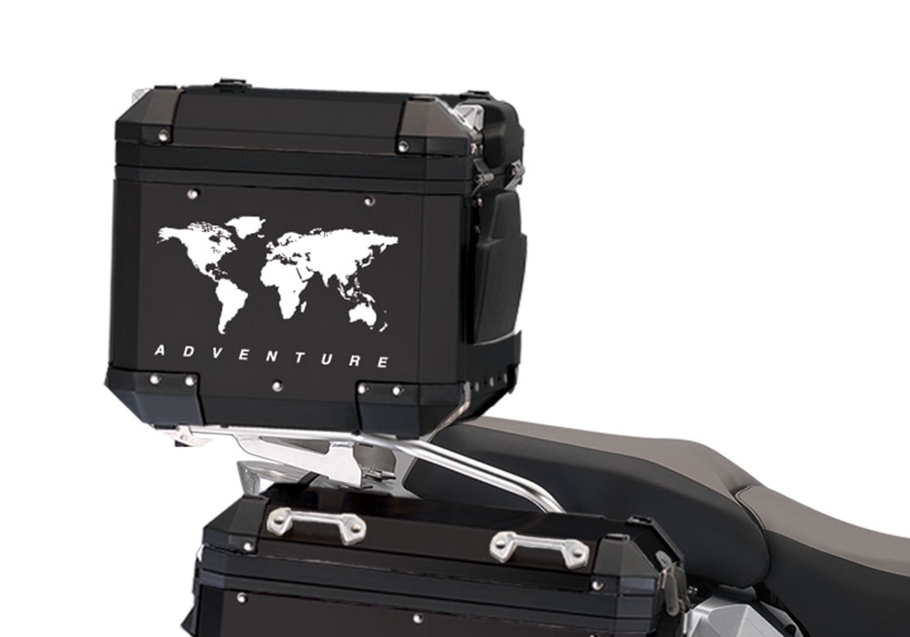 Signature Custom Designs THE GLOBE Series styling kit gives your BMW Black Aluminum Top Box a unique and Adventure character.