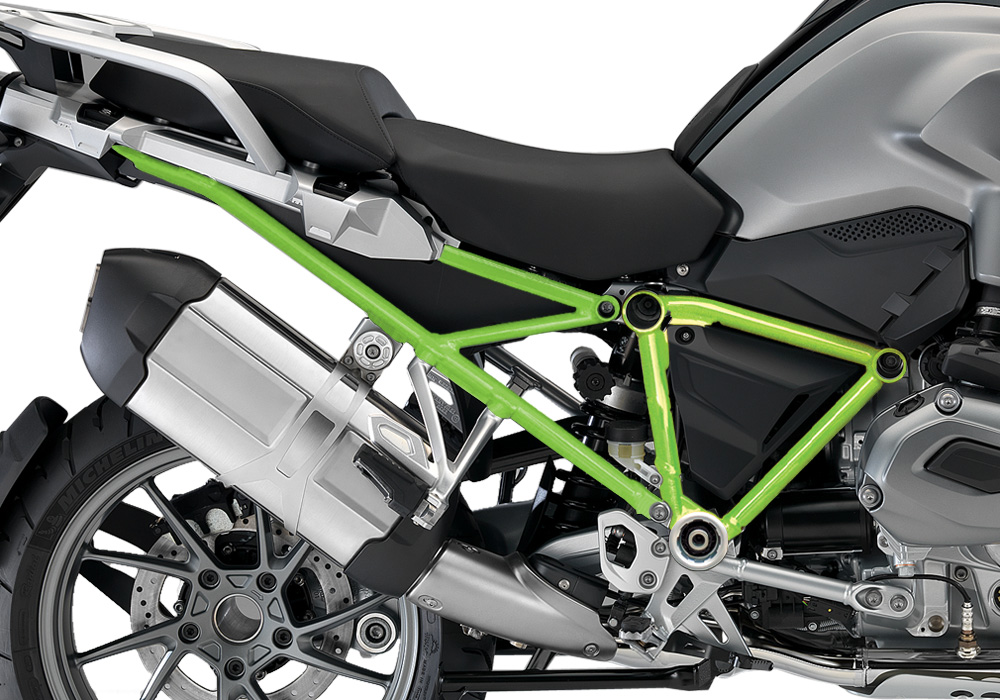 Signature Custom Designs Revolutionary and Innovative GS Frame Styling Kit, changes the color of your BMW R1200GS LC frame giving a powder coating effect, without affecting the original color by using ready to fit sticker kit.