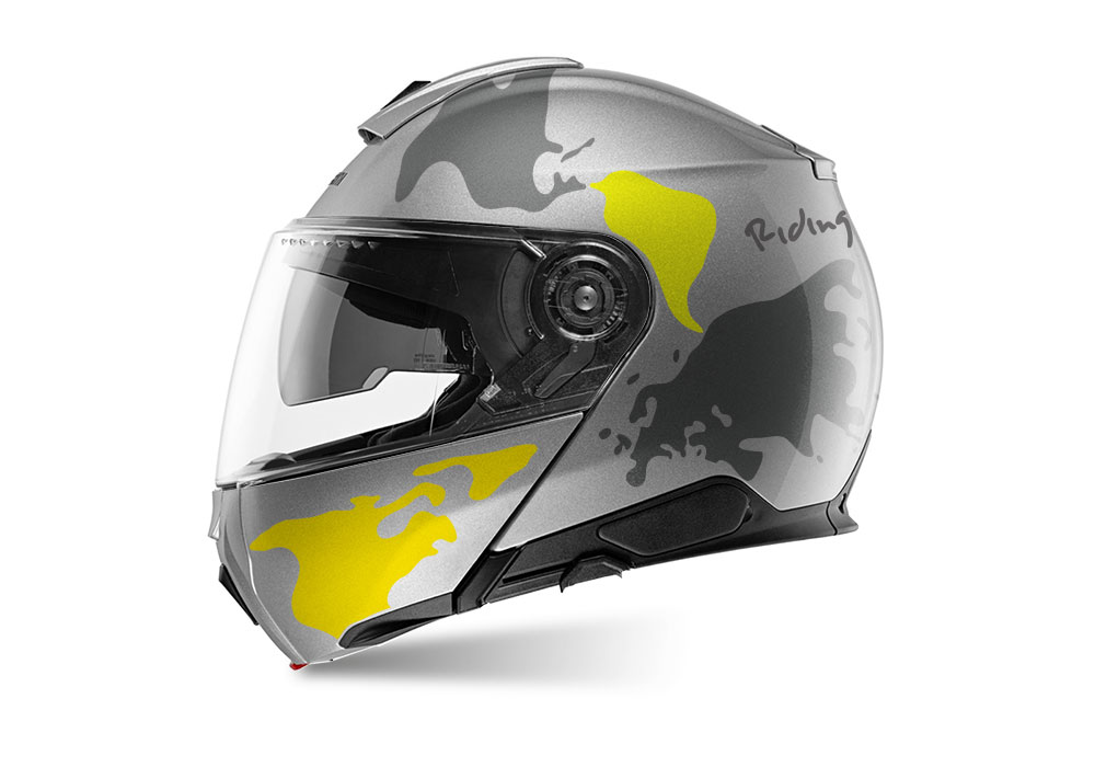 Schuberth C5 Helmet (Silver) The Globe Series Yellow & Grey Stickers
