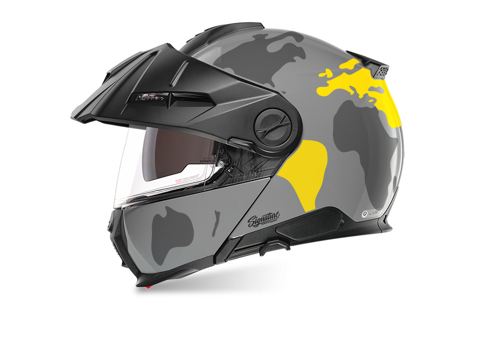 Signature Custom Designs THE GLOBE Series styling kit gives your Schuberth E2 Helmet a unique and adventurous character.