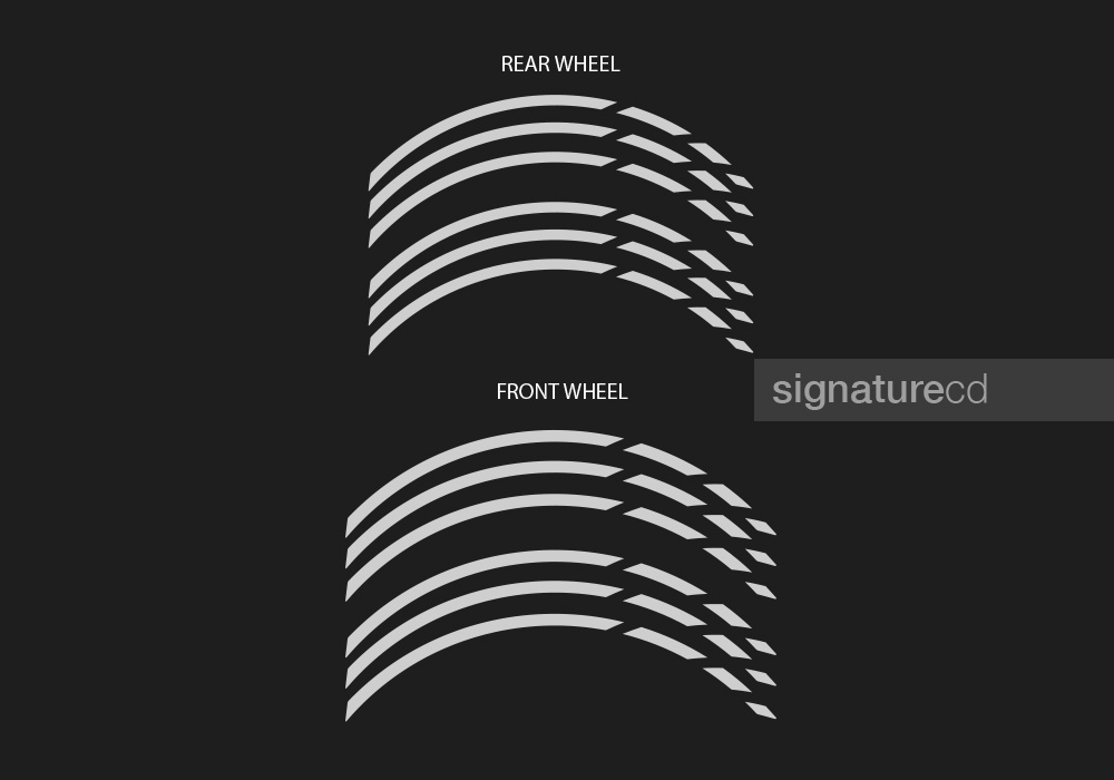 Each wheel set includes:• 3 stripes per side• 6 stripes per wheel (left & right application)Engineered for perfect fitment on:• Front wheels: 21″ or 19″• Rear wheels: 18″ or 17″